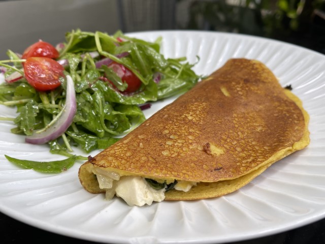 אומלט פטריות ובצל (על בסיס טופו) המוגש עם סלטון צילום: רונית סבירסקי