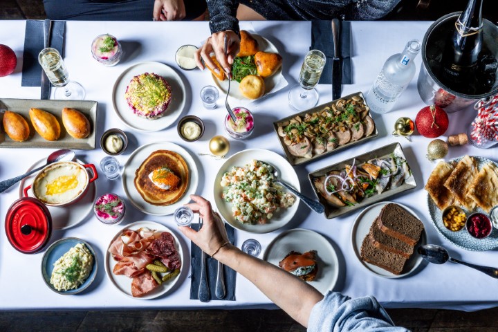 קפה 65 מציע בראנץ' המבוסס על המטבח הסובייטי המסורתי. התפריט כולל בופה "זקוסקי" (דג מלוח, סלט אוליבייה, נקניקים), וודקה קפואה, מנות עיקריות כגון פירושקי ודריאניקי, וקינוחי מדוביק וקרטושקה. "דד מורוז" ינכח לצילומים עם הסועדים.